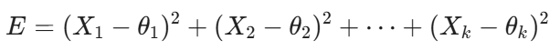 El error total de nuestro estimador es la suma de los cuadrados de los errores individuales. Si tenemos k dimensiones, el error total (la distancia al cuadrado desde nuestra estimación al valor real) es: